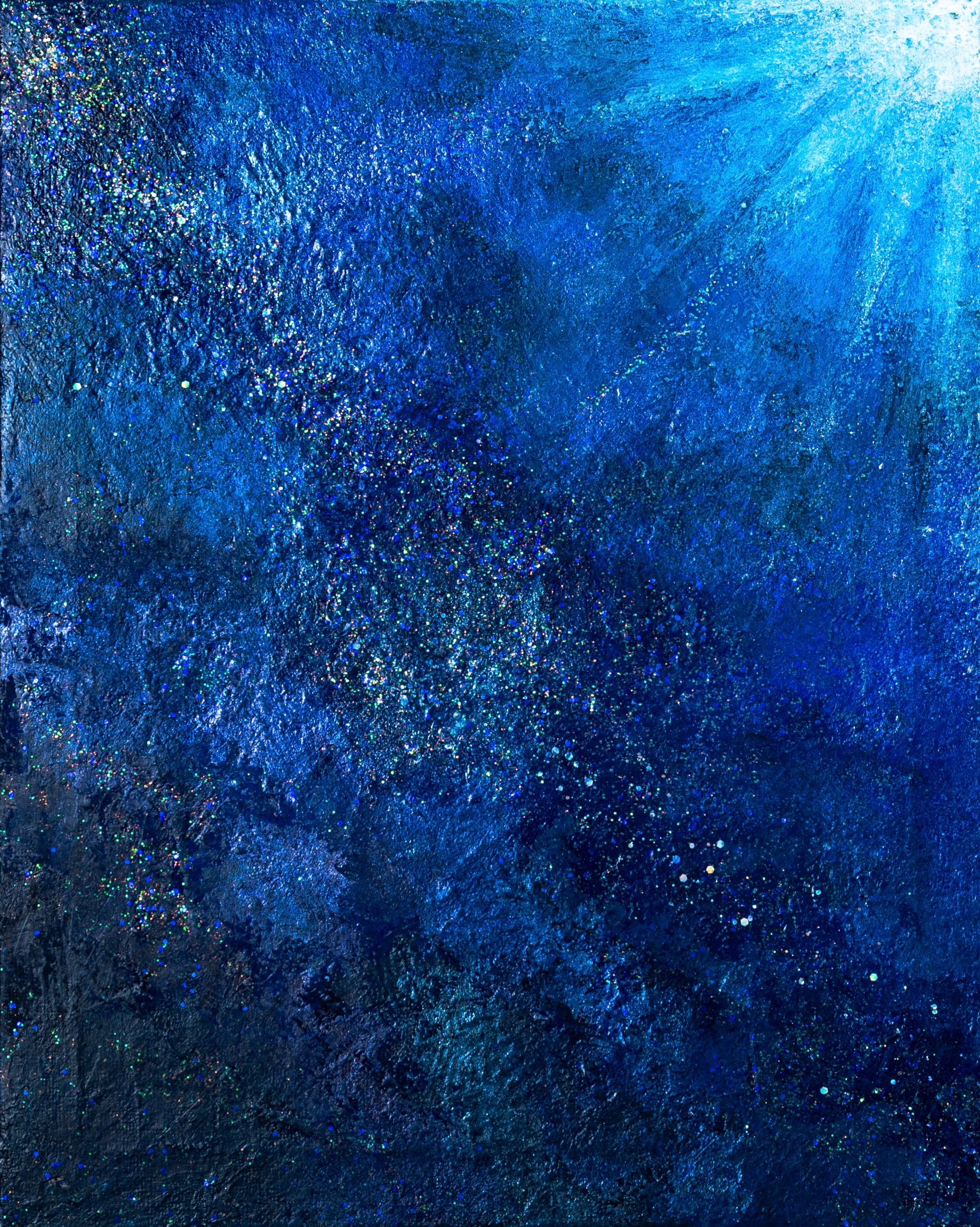 <<BASE限定特別価格>> 送料無料、本体価格で販売!(〜6/25まで) サイズ:F3(273mm×220mm) 解説:海の底から見る海の空 それはとても輝いていて。 サイズ:F3サイズ(273mm x 220mm) 使用画材:アクリル絵具、ラメ、ネイル用水彩絵具、キャンバス
