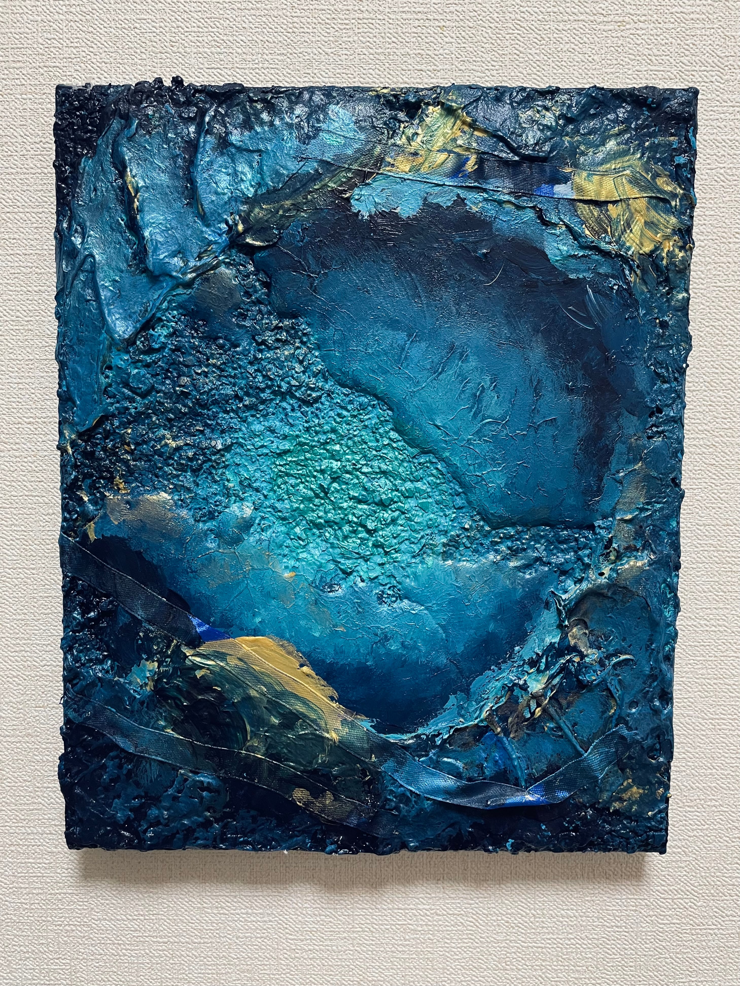 使用画材:アクリル絵具、メディウム、卵の殻、レジン、リボン、ネイル用水彩絵具、キャンバス